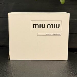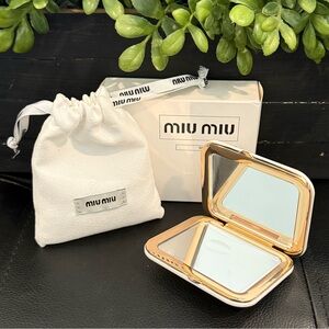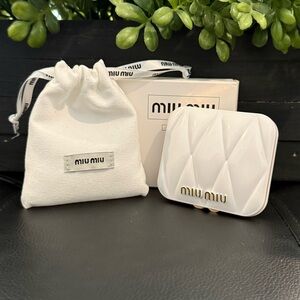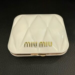 Chic Miu Miu compact mirror. Features elegant white with gold accents. Perfect for on-the-go touch-ups.