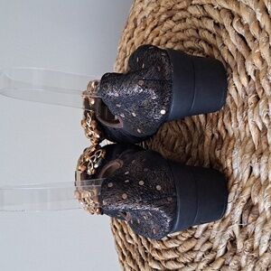 Trending luxury brand Miu Miu women's metallic brown dot stretch low wedge slip on ballet shoes with 2" heels, bead and gold metal link fronts and rubber soles. Pre-owned and in very gently used condition. Please see pictures.