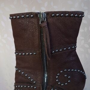Women's Stud Embellished Leather Ankle Boots by Miu Miu in Brown. Size 37.