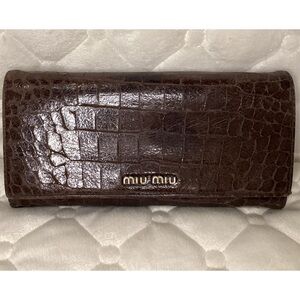 Miu Miu wallet in brown alligator embossed leather shows some normal wear and tear but still is in great condition.