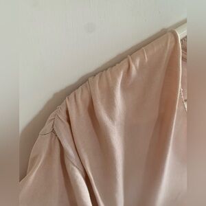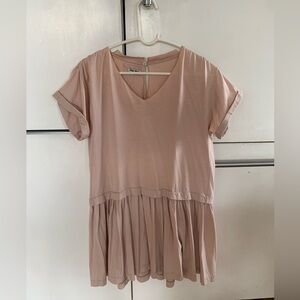 Cotton mini dress in pale pink, flowy fit with drop waist, folded sleeves. 100% cotton. In very good used condition with normal fading throughout. Marked size Small.