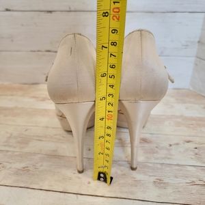 Miu Miu champagne satin platform Mary jane heels with scarlet captoe. Pre-owned condition with marks to satin shown in pictures. overall excellent Pre-owned condition. euro size 39