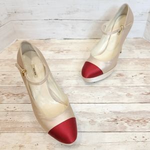 Miu Miu champagne satin platform Mary jane heels with scarlet captoe