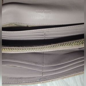 Nice Miu Miu bifold croc-embossed leather wallet in very good condition. The interior is very clean (other than the coin compartment)--look at that beautiful pink! Callouts: There is some wear/dirt to the exterior consistent with what you'd normally see on the Miu Miu wallets, and corner rubbing (I have partly touched that up). Still a great luxury piece! Priced to match condition.