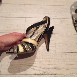 All Miu Miu shoes run small. Vintage, and has navy blue glitter, cream leather and silver glitter. Heel height is 3 inches ⭐️Sale⭐️