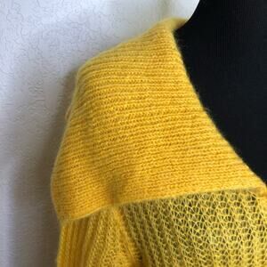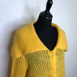 Miu Miu gold yellow mohair blend button front collared cardigan. Oversized statement fold over collar. Button front. Lightweight. Size tag has been removed but best fits size Large to Extra Large based on below measurements. Material content tag has been removed.