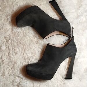 size 38.5, US 7.5-8. beautiful grey brushed suede covering whole boot. heel and platform. 5 inch heel, 1 inch platform. zipper up back of the foot.