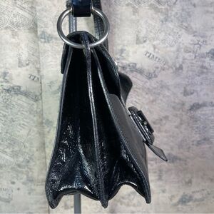The shiny patent leather handle with a buckle strap front and snap closure exudes elegance and adds a subtle edginess to your ensemble.