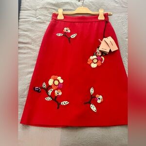 Chic red A-line skirt. Features colorful floral embroidery. Ideal for a stylish look.