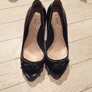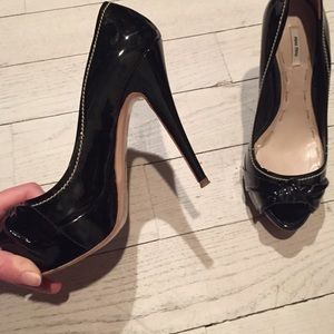 Black patent leather. 5 inch heels. Platform (1 inch) runs super small so fits a 6-6.5