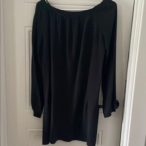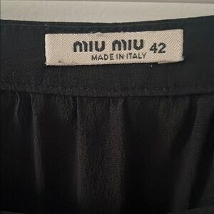 Preowned in excellent condition. Stylish round neck, long sleeved black dress by Miu Miu. Made in Italy. It is not lined and has pleated details across the bodice and arms.