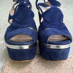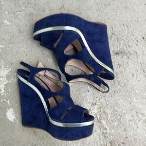 These platforms are royal blue with silver. Please check out the pictures. They’re not perfect but they are still in good condition. Platform height is 1.75 inches heel height is 5.5 inches.