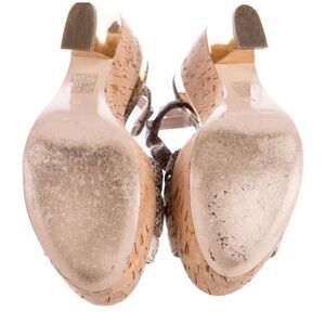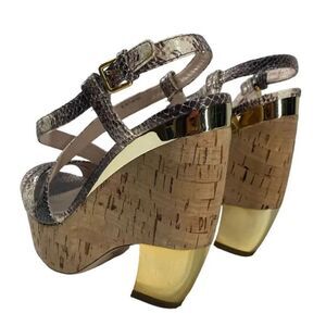 MIU MIU St Ayer’s Platform Wedge. -Size 9/IT39 Heels 5.5” Platform 1.5”. Wear on sole and scratches on heel. See picture for wear. Comes with original box. Open to offers #miumiu #miucciaprada #prada #heels Step into elegance with Miu Miu's wedge sandals, featuring a striking metallic snakeskin pattern. The X-pattern straps and ankle buckle closure ensure a secure fit, while the cork-style platform adds height and stability. Perfect for adding a touch of glamour to any summer outfit. These Miu Miu sandals are super easy to style and they look great on the feet