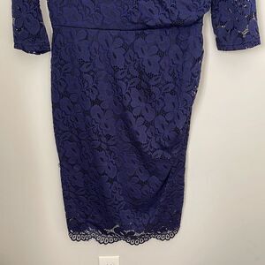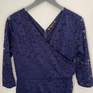 Description: This dress is a great dress for any occasion. V-neckline in back and front. 3/4 length sleeves. Sheath, wrap style. Scalloped hem line. Polyester shell. Nylon/spandex lining.