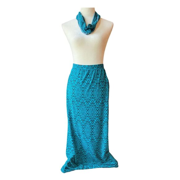 Experience comfort and style with the Mix & Co. Skirt with Scarf. The green and black pull on skirt features an elastic waistband for the perfect fit, while the infinity scarf adds a touch of elegance to any outfit. Perfect for any occasion.