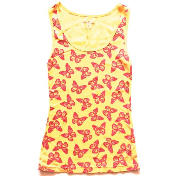Mix & Co graphic tank top, size S. Pretty yellow tank with pink butterflies. Perfect for summer! Very good pre-owned condition. Please see photos for details.