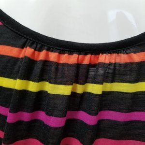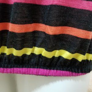 Striped cold shoulder top. Ruching at the neckline. Tie sleeve cuffs. Elastic on bottom hem.