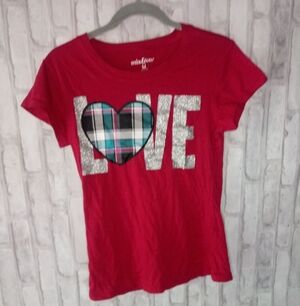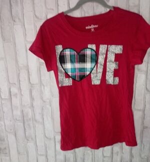 Mix & Co tee shirt has the word LOVE with a plaid heart O
