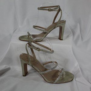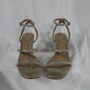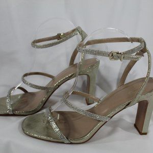 Description: gold/metallic strappy heel sandal, adjustable ankle strap closure, square open toe, covered heel