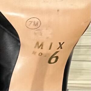 The Mix No. 6 black pump is designed for women who appreciate style and elegance. This stiletto heel features a pointed toe and ultra-high heel height, making it ideal for party or cocktail occasions. The upper material is synthetic, and the shoe is adorned with studded detailing for added flair. It is a US size 7M. The item is pre-owned.