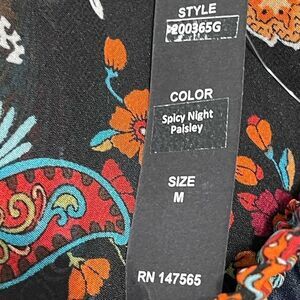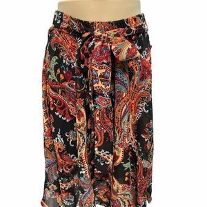 Features: bow on waist that ties, fully lined, handkerchief scarf, spicy night paisley, black, orange, blue and red in pattern, flirty flowing, boho, pull on, elastic waistband