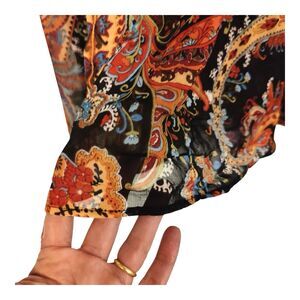 Made of polyester with a chiffon skirt and stretchy waist and lining, this skirt offers a comfortable and elegant fit. The paisley and floral pattern in vibrant colors like orange, aqua, and red adds a bohemian touch to the maxi length design.