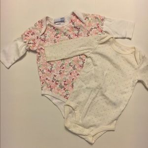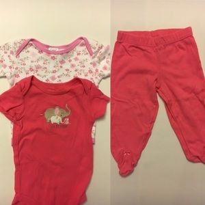 Two long sleeve onsies , two short sleeve onsies and one pair of pants. Butterfly, flower, polka dots, and elephant "I love my family" detail.