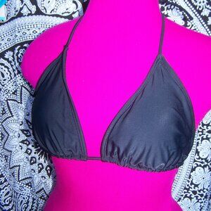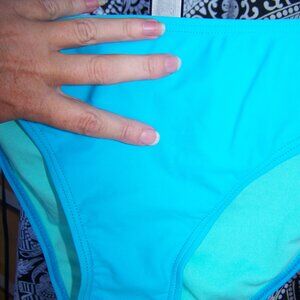 Black string bikini top by OP, size XL (5-17) with blue/teal scrunch butt bikini bottoms by SO (NWT), Sz L. Top has removable pads. Bottoms are NWT and still have the hygienic sticker in them. Some white-ish spots on the bottoms, looks like it may be from being stored & I would think it would wash off once the tags are removed, they are not really noticeable though.