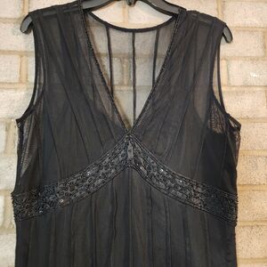 Chic black sleeveless dress with lace detailing. Perfect for evening wear.