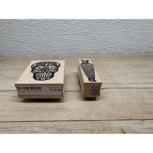 Mixed Brands Set Of 2 Wood Mounted Rubber Stamps Skull & Mummy Cat.Invery good condition