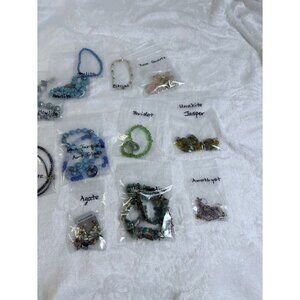 This collection of gemstone jewelry includes an array of bracelets and earrings, showcasing various natural stones like agate, jade, and amethyst. Ideal for accessorizing or resale.