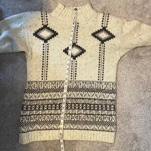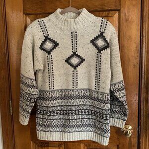 A pretty patterned mock neck sweater of mixed gray colors. Vintage late 80's.  Base color is a grayish cream tone with flecks of gray. The border pattern on the bottom and on the sleeves features yarns of mixed textures. Thin shoulder pads that can be easily removed if you wish. 85% acrylic, 13% wool, 2% other. Size M; measures about 27" from top of collar to bottom hem.  Sleeve is about 20" from cuff to armpit. Machine wash warm.