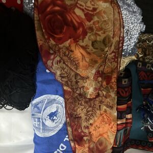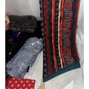Add a pop of color to your wardrobe with this mixed lot of 15 vintage and modern scarves, headwraps, and handkerchiefs. Perfect for special occasions or adding a touch of style to your everyday outfits, these pieces feature a variety of multi-colored designs that are sure to catch the eye. Made from a mix of materials and spanning several decades, each item in this collection is unique and adds a bit of character to your wardrobe. Whether you're a collector of vintage accessories or simply looking for a way to elevate your style, this mixed lot has something for everyone.
