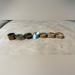 This is a set of seven vintage napkin holder rings that are perfect for any occasion. Made of metal, these rings come in a variety of multicolors and add a touch of elegance to any table setting. Whether you're collecting them or simply looking for a unique way to hold your napkins, these napkin holders are sure to impress your guests.