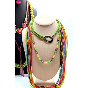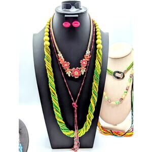 Mixed Lot of 13 Colorful Jewelry Pieces -- 6 Necklaces 2 Pr Earrings 5 Bracelets. Let your personality shine with this vibrant, colorful mixed lot of jewelry pieces. Pre-owned, this mixed lot of jewelry is in various conditions and being sold as is. All wearable to excellent condition. Both pair of earrings are for pierced ears. The items chosen for my lots are items I previously had set aside to list but decided to lot up due to a high volume of inventory. Because they are lotted up and at a reduced price, I may have not taken the time to clean them. Have fun mixing and matching these pieces with each other or other pieces.