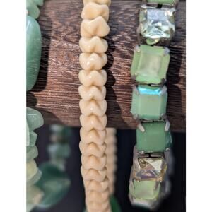 Mixed Lot of Green Stone Theme Jewelry 1 Necklace 4 Bracelets 1 Pr Earrings. Pre-owned, this mixed lot of jewelry is in various conditions and being sold as is. The items chosen for my lots are items I previously had set aside to sell but decided to lot up due to a high volume of inventory. Because they are lotted up and at a reduced price, I have not taken the time to clean them.