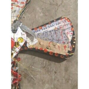 Accented with vintage papers, fabric, junk mail and atlas map pieces, sheet music, metallic threads, fibers, wire, beads, buttons, charms, sequins, a hand-sewn puffy fabric heart