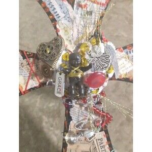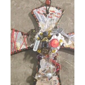 Mixed Media Christian Assemblage Art Wooden Cross Jesus Beads Charms Wall Decor