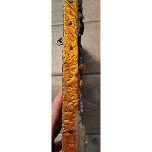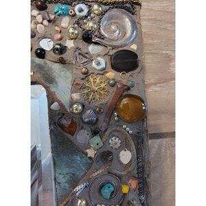 Elevate your decor with this unique steampunk-inspired wall art mirror. Featuring a blend of coins, beads, pottery and more, this mixed media mirror piece adds character to any space. This nicely weighted piece measures 8.5" x 11". Please see all photographs as they are part of the description. Shipped with USPS Ground Mail.