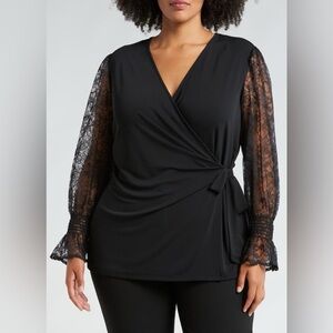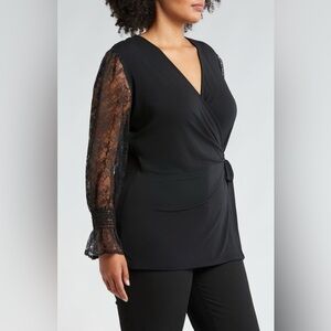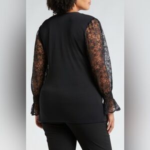 Lace-lilted sleeves join smooth matte jersey in a graceful top that works for fun or fancy.