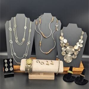 Beautiful mixed-metal and earthy-tone jewelry set featuring silver, bronze, and gold tones with natural stone accents. Perfect for resellers or anyone who loves artisan-style statement pieces.