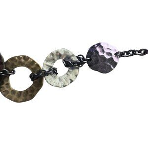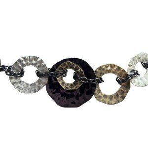 Funky mixed metal statement necklace with graduated alternating gold tone, silver tone, and deep purple hammered metal discs and rings connected by a chunky chain. Lobster claw closure.