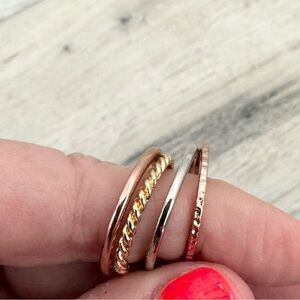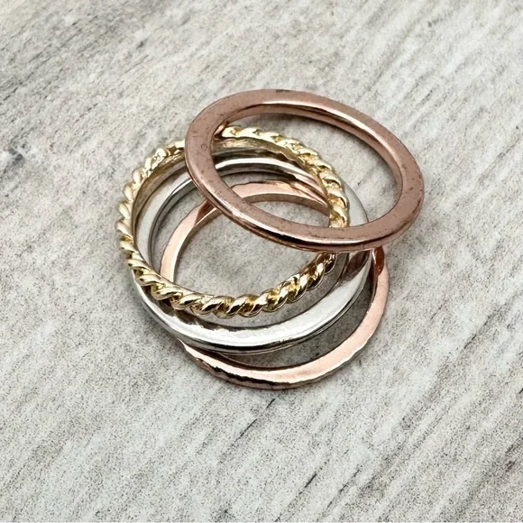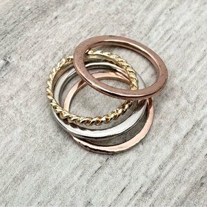 Mixed Metal Stackable Rings. Size 7 1/2. Enhance your style with these elegant stacked rings in rose gold tone, silver tone and gold tone. Mixed metal tones. Perfect for any occasion. Wear alone or all together. Pre loved, gently worn. Excellent condition.