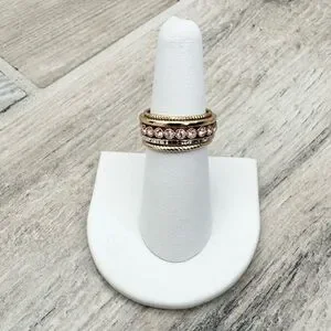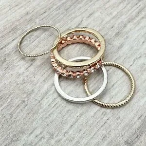 Mixed Metal Stackable Rings. Size 7. The intricate design and sparkling accents make it a must-have accessory. Mixed metal tones. Set of 5. Wear together or alone. Pre loved, gently worn. Excellent condition.
