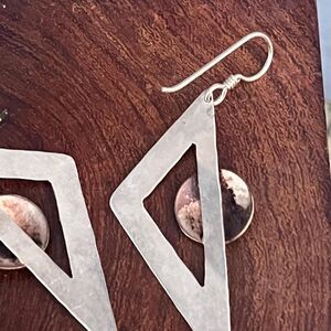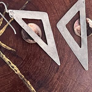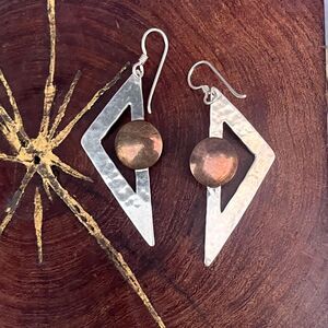 Vintage triangle earrings with copper and sterling silver. Amazing large sized dangle with hook backs. No makers mark. Lightweight. Nice brutalist industrial geometric feel.