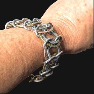 This special bracelet is a lovely mix of hammered metal rings held together with a series of smaller hoops and closing with a toggle clasp. Excellent used condition, clean, no tarnish, no flaws.