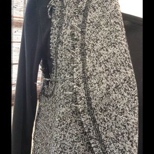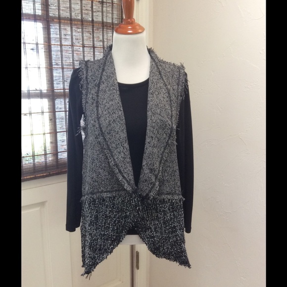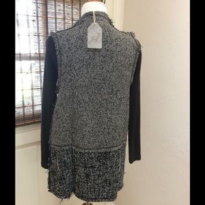 Mixed pattern tweed vest with shawl collar and high/low hem. Frayed seams are part of the design. 100% poly