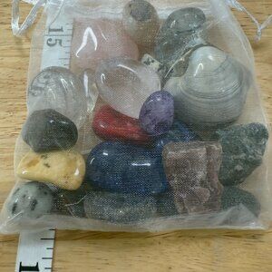 A curated assortment of polished natural gemstones and fossils in a sheer drawstring bag. Ideal for crafting, collecting, or educational purposes.