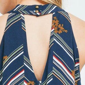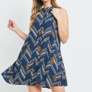 Mixed Print Mini Dress. Charming contrasting floral prints brighten a flouncy, shift swing hem sleeveless minidress. High neckline cutaway shoulders cut out v-back. Button closure. Interrupted chevron uneven stripe print. Brand: Entro.