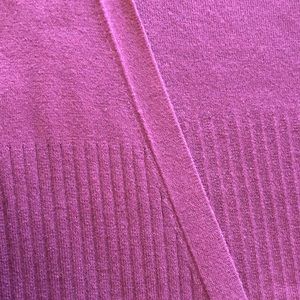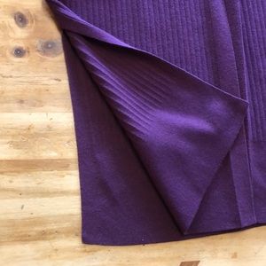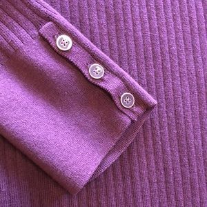Eggplant (truest color representation in first photo) no button front, 37 inch sweater with 10 inch side slits, 3 button cuffs. Sleeves are 24 inches. Perfect condition!
